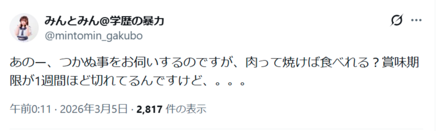 【疑問】九大卒アイドル「あのー、肉って焼けば食べれる?賞味期限が1週間ほど切れてるんですけど」