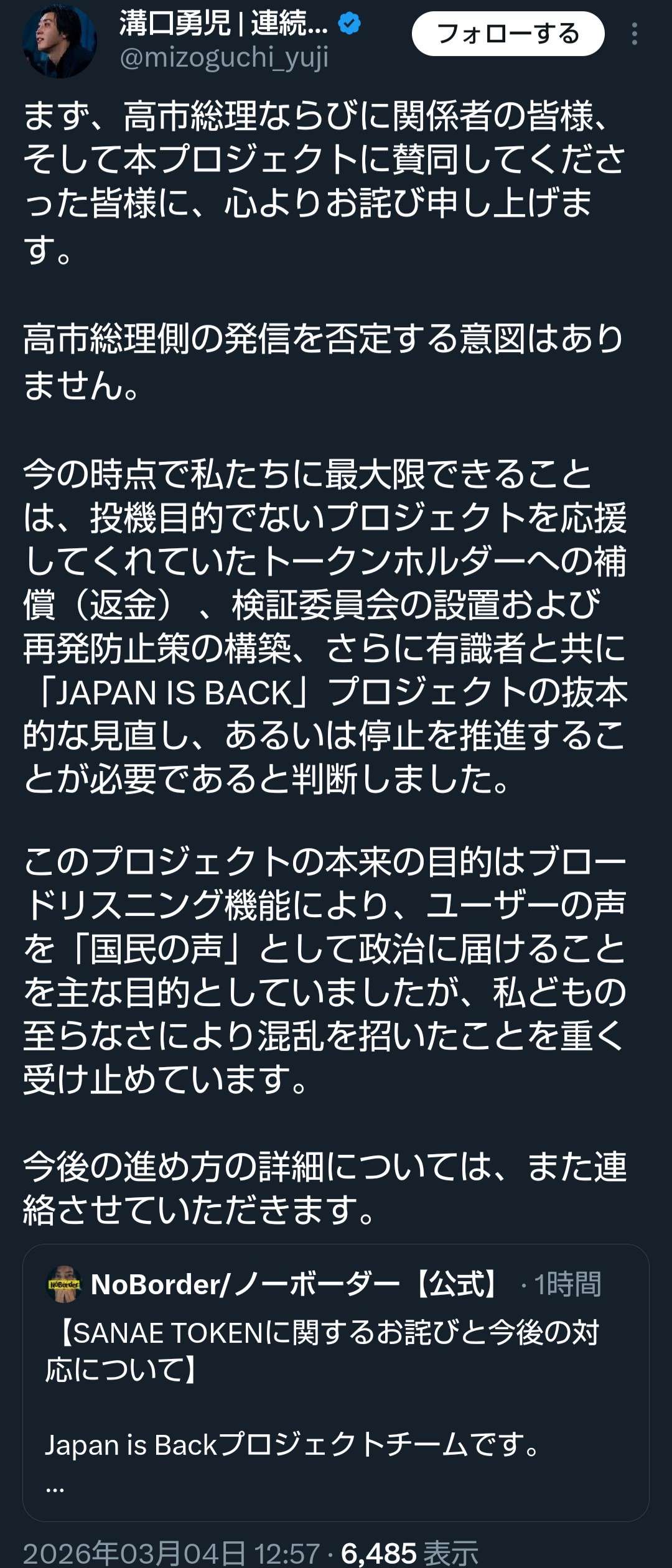 【悲報】サナエトークン溝口「高市総理側の発信を否定する意図はありません。」←これどういう意味?wwww