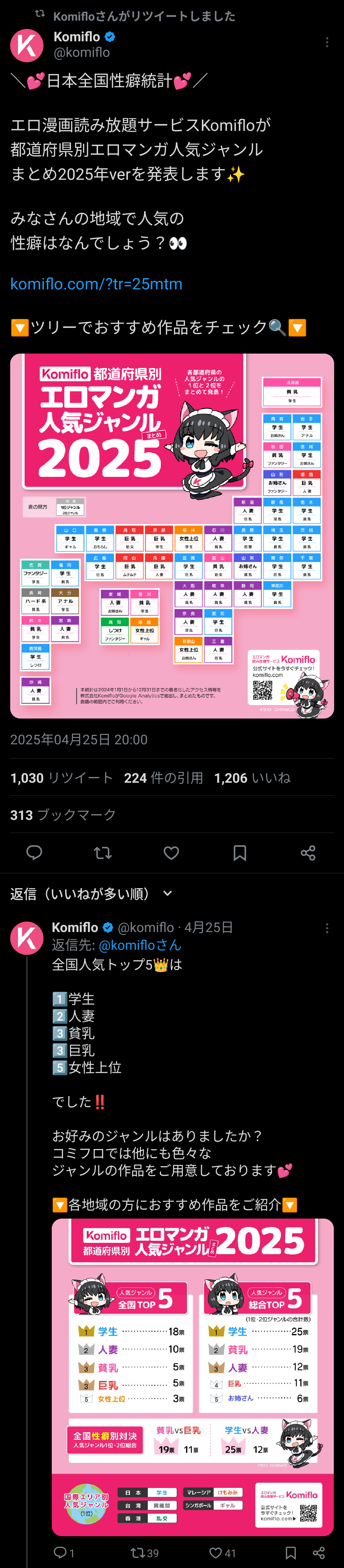 【画像】成年向け漫画の「都道府県別人気ジャンル」2025が発表!お前らの住んでるところは何が人気?