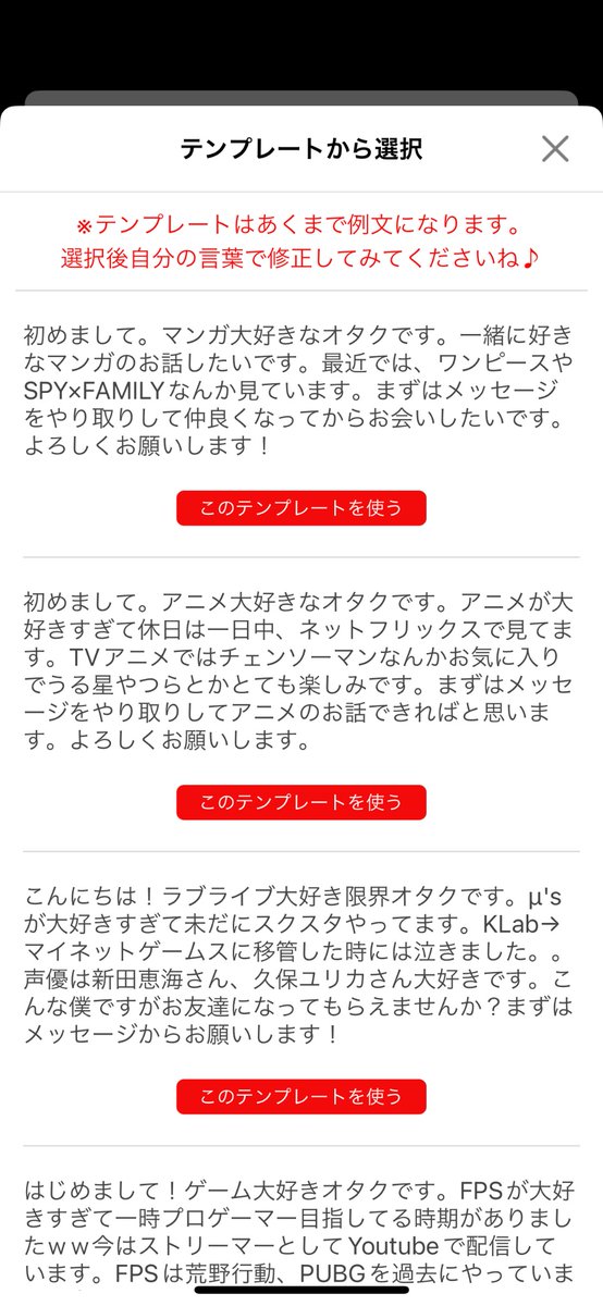 【画像】オタク限定マッチングアプリ、オタクのために用意されたテンプレがヤバいwww