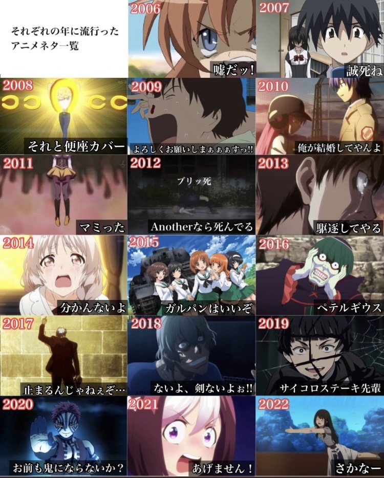 【画像】「それぞれの年に流行ったアニメネタ」が発表 オタクなら全部分かるやろ?