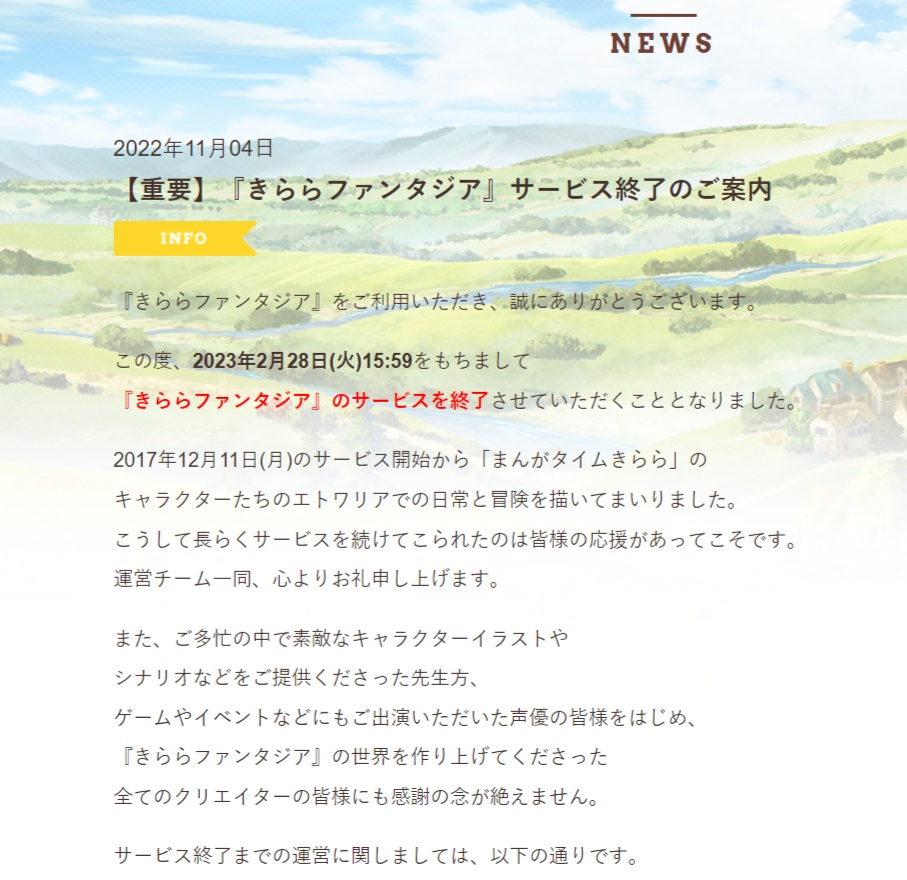 【悲報】『きららファンタジア』、サービス終了へwwwww