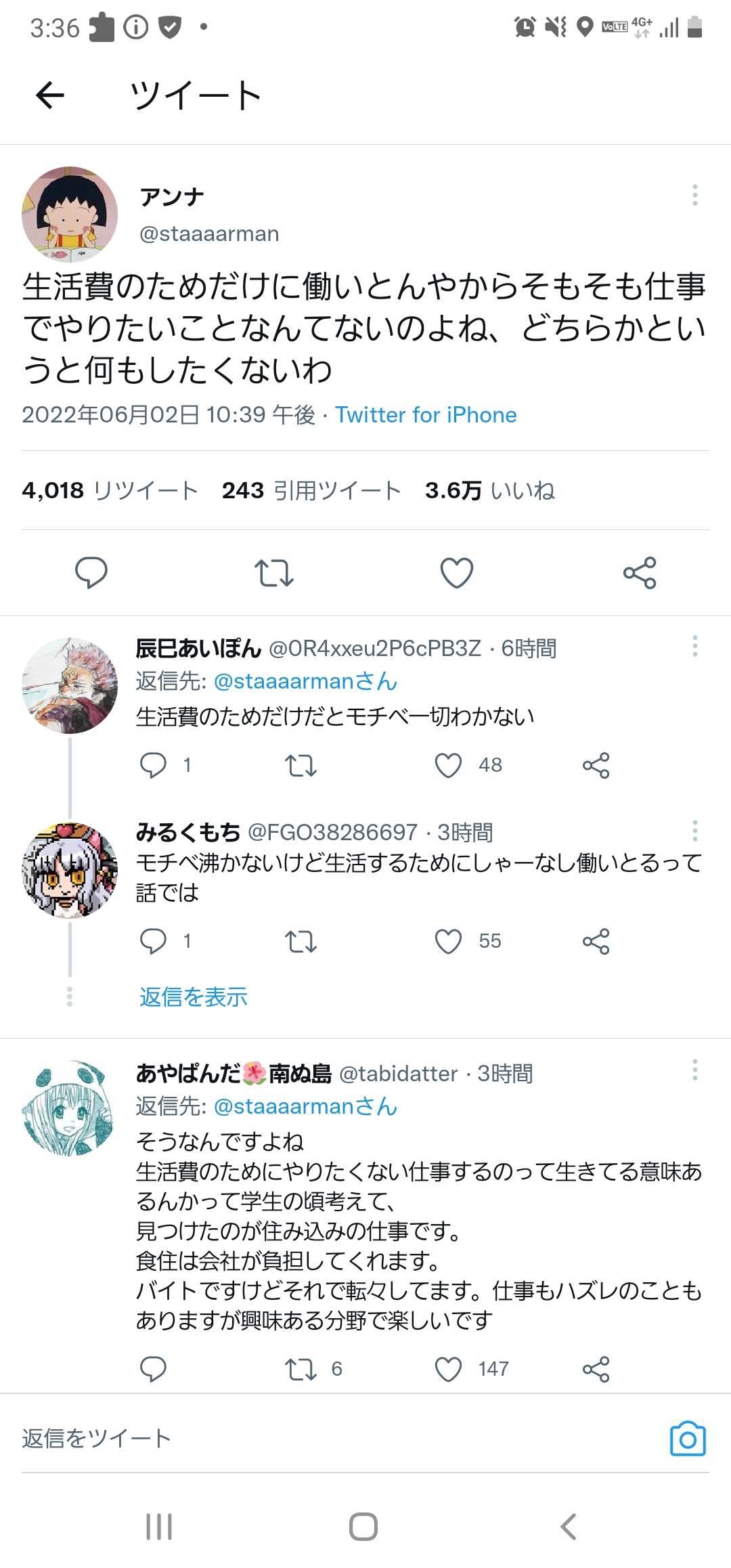 【悲報】アニメアイコン「仕事のやりがいなんてない。生活費のために働いてるだけ」←3.6万いいね