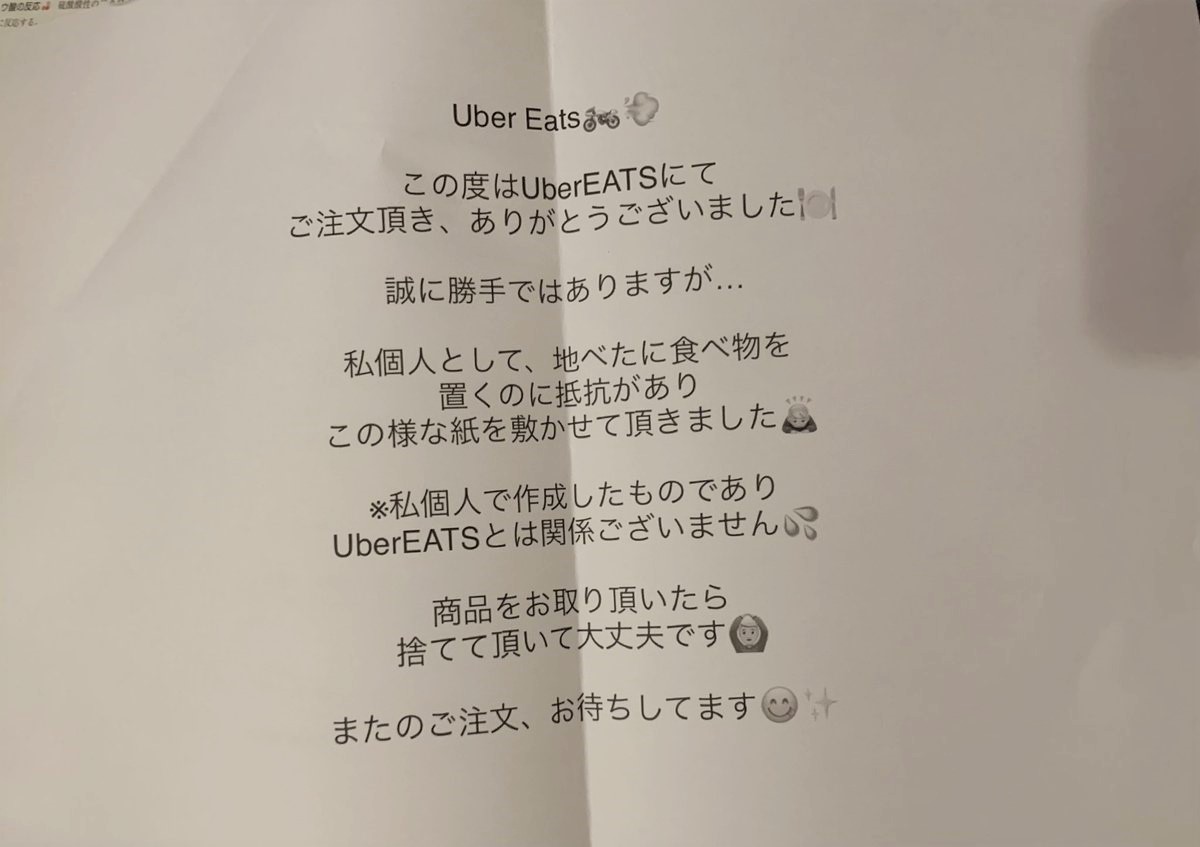 【画像】アニメアイコン「UberEats頼んだら変な紙置いてあったw」パシャ→22000いいね