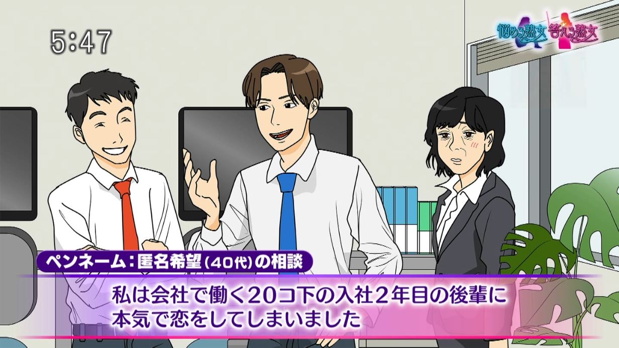【悲報】このイラストのババア先輩「20歳年下の新入社員に恋をした。告白するべき?」