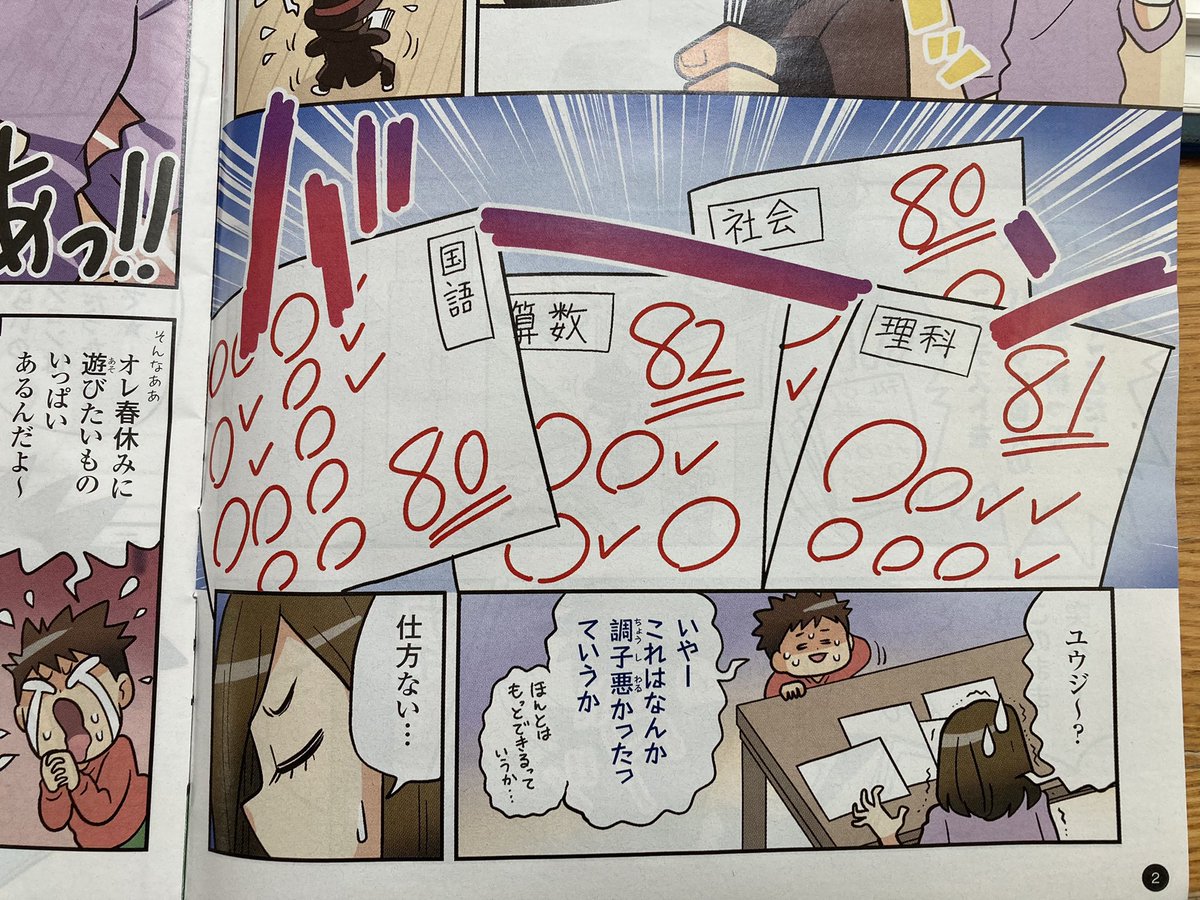 【悲報】進研ゼミ漫画のキッズ「テストの結果はこちら!80!80!81!82!」母「…」