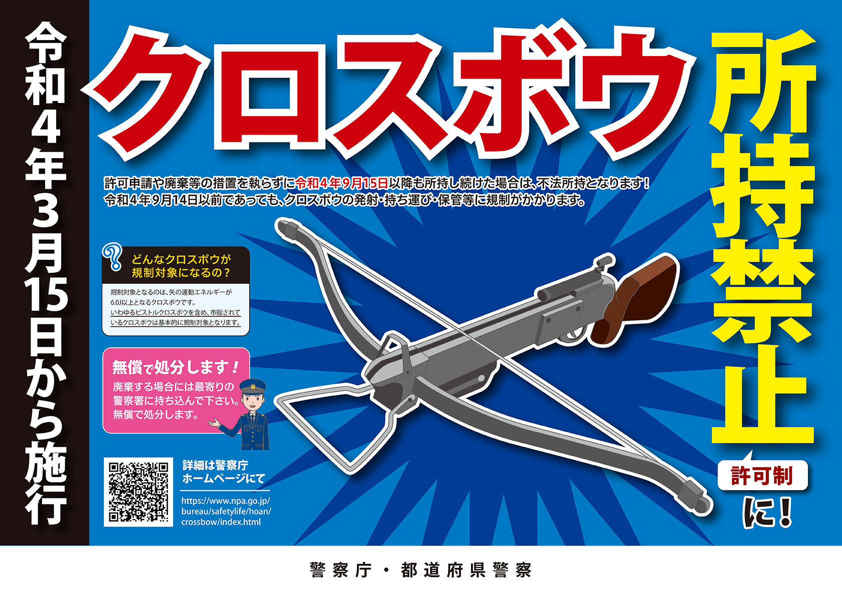 【悲報】漫画やアニメでおなじみ『クロスボウ』、今日から所持だけでお縄に…
