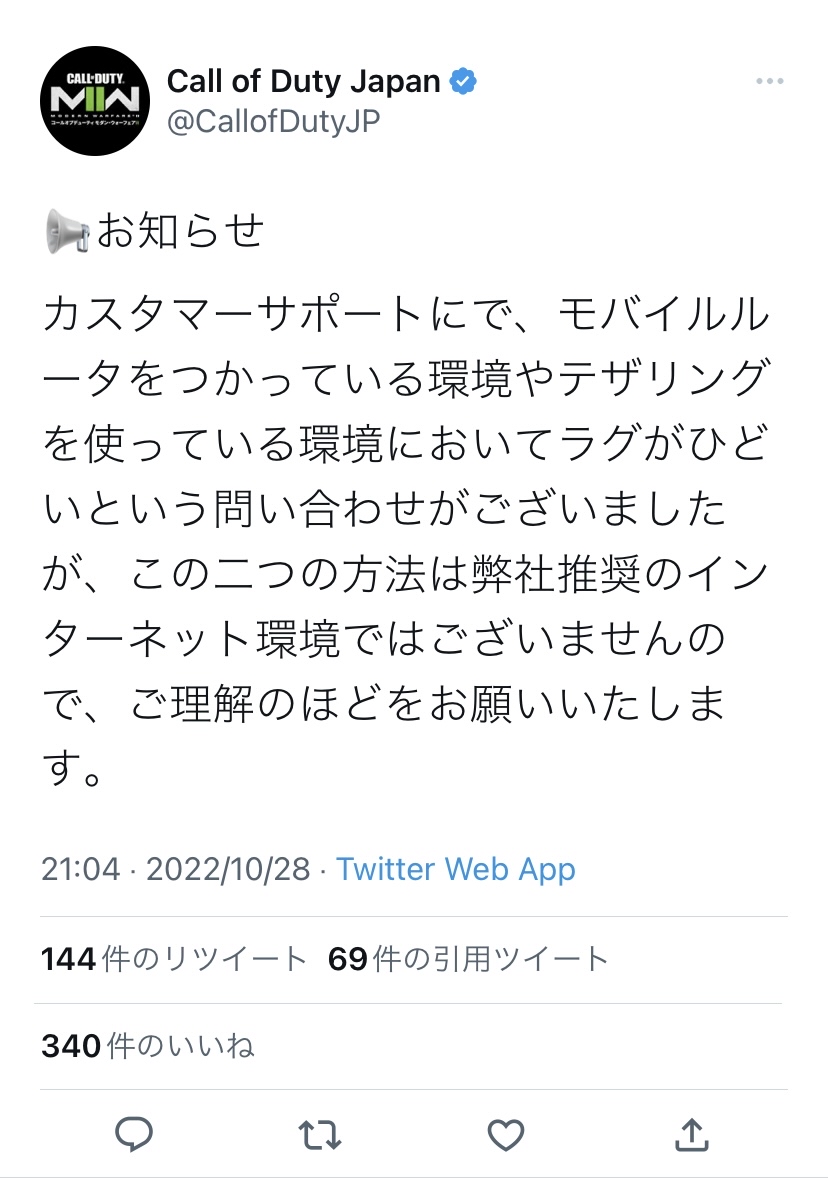 【悲報】FPSクレーマー「モバイルルータだとラグいんだけど!」CoD公式「ハァ…」