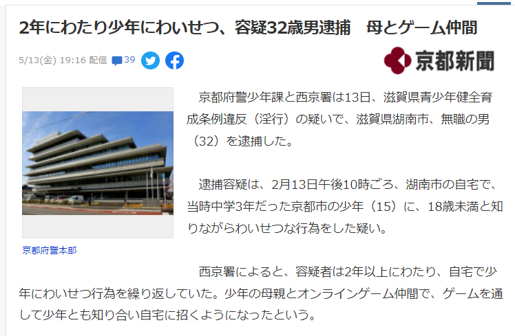 【悲報】無職のおじさん、オンラインゲームで知り合った中学生とキスして逮捕されてしまうwwww
