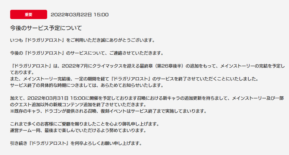 【悲報】有名ソシャゲ『ドラガリアロスト』サービス終了のお知らせ…