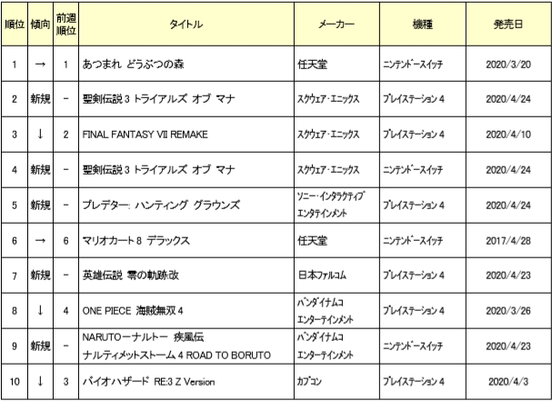 【TSUTAYA】1位どうぶつの森 2位聖剣 3位FF7