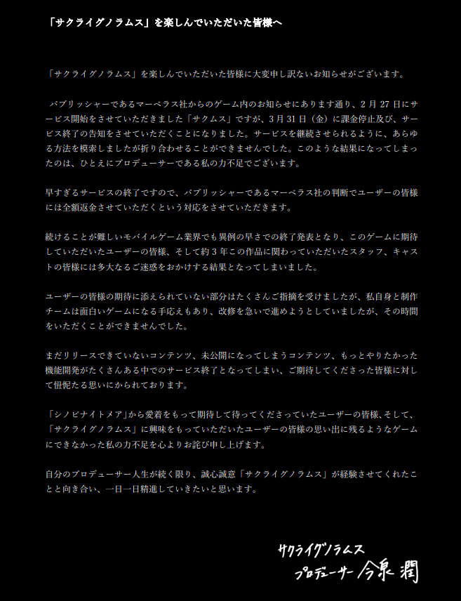 【悲報】1ヶ月で終了したソシャゲプロデューサー、陳謝・・・・