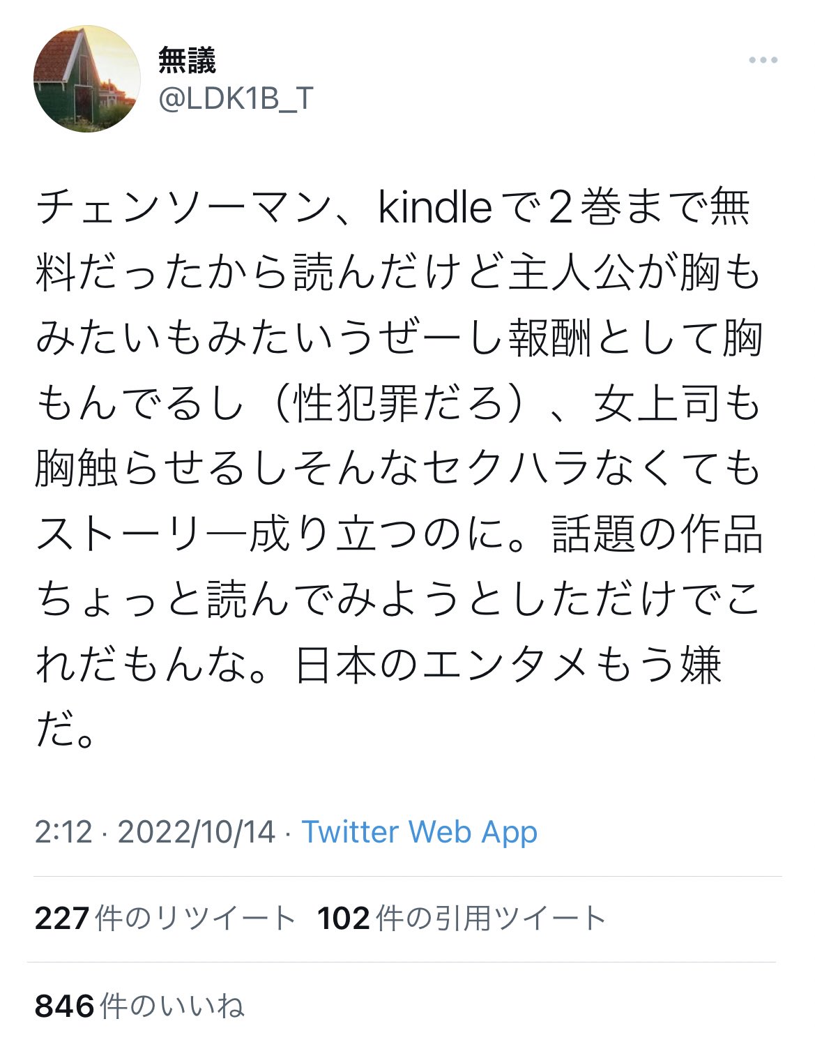 【悲報】女性「チェンソーマン読んだけど、セクハラなくてもストーリー成り立つだろ。日本のエンタメもう嫌だ」