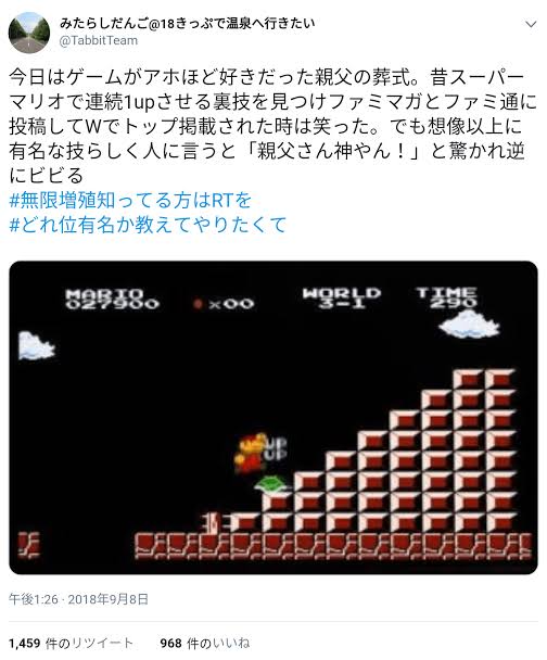 【悲報】Twitter民「マリオの無限1upを発見したのは親父」←この嘘松疑惑騒動wwwww