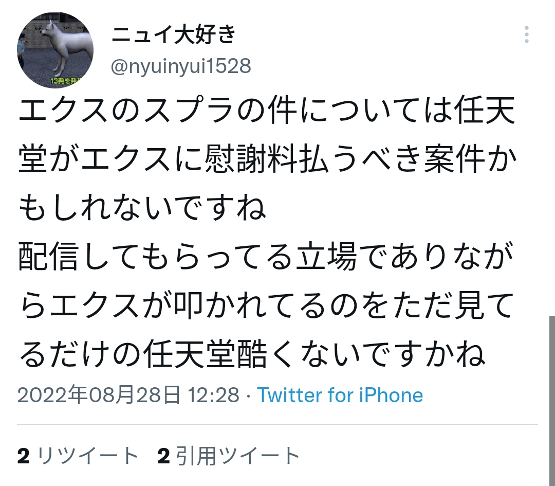 【画像】スプラ3を削除されたVtuberの信者「宣伝してあげてるのに任天堂は酷い!慰謝料を払うべき!」