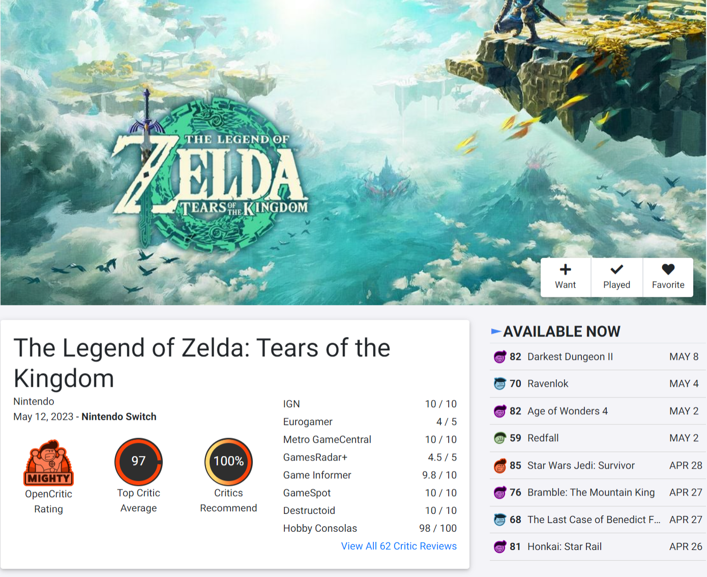 【衝撃】ゼルダ新作ティアキン、メタスコア98スタートwww【ゼルダの伝説 ティアーズ オブ ザ キングダム】