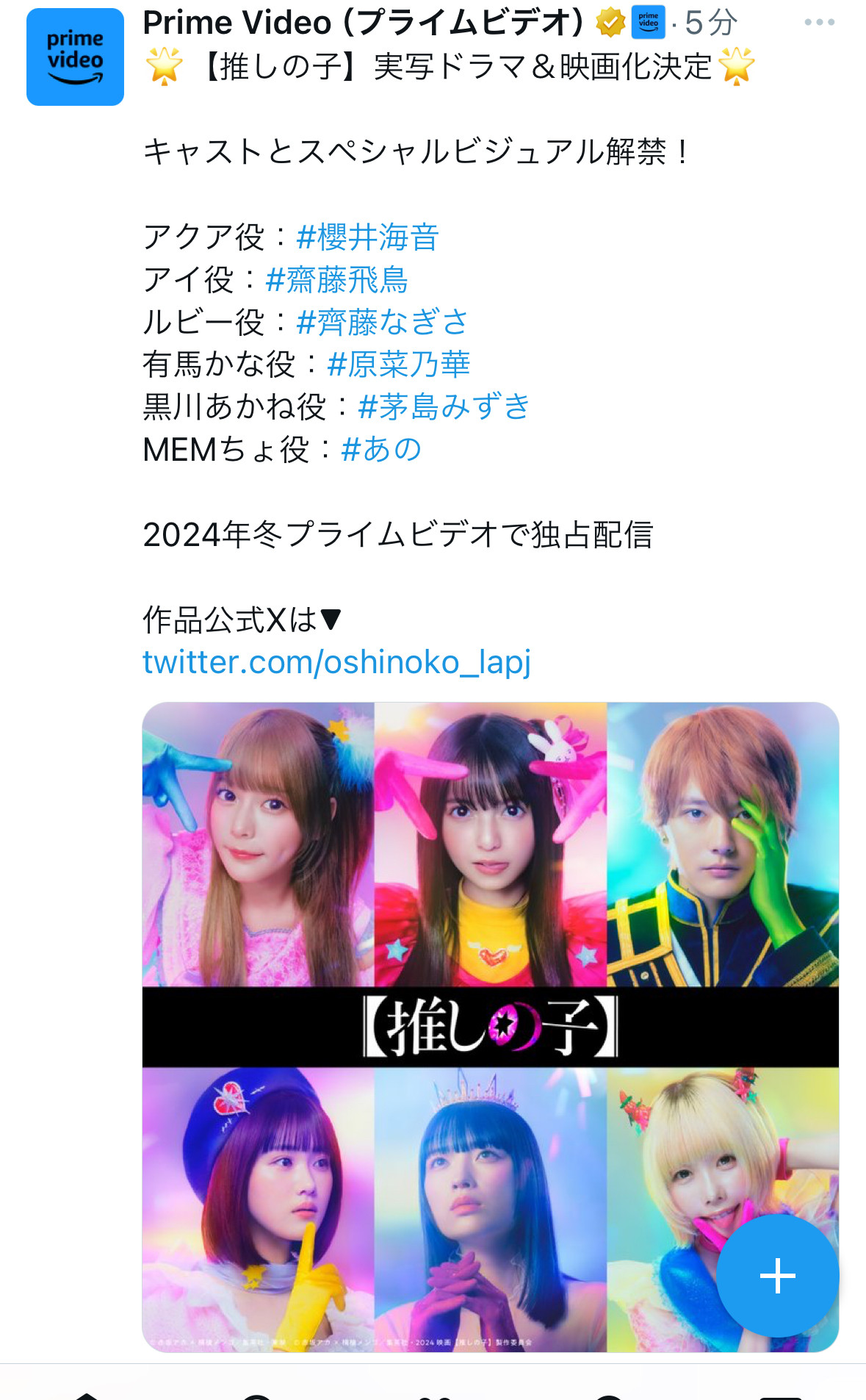 【推しの子】実写化決定!ドラマ配信・映画劇場公開。アクア:櫻井海音、アイ:齋藤飛鳥、ルビー:齊藤なぎさ、有馬かな:原菜乃華、黒川あかね:茅島みずき、MEMちょ:あの(敬称略)