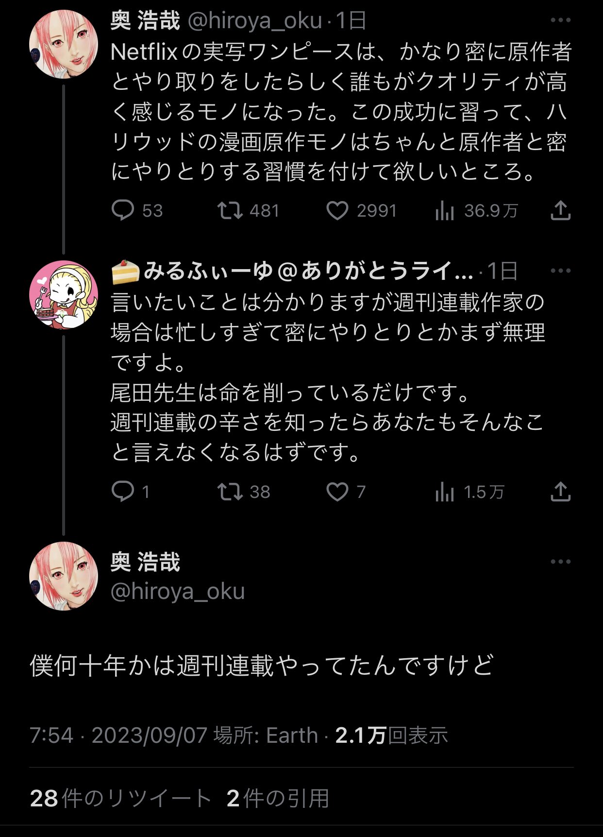 【正論】GANTZ作者「実写ワンピースは、原作者と密にやり取りしたから高クオリティになった。この成功に習って原作者とやり取りする習慣を付けて欲しい」