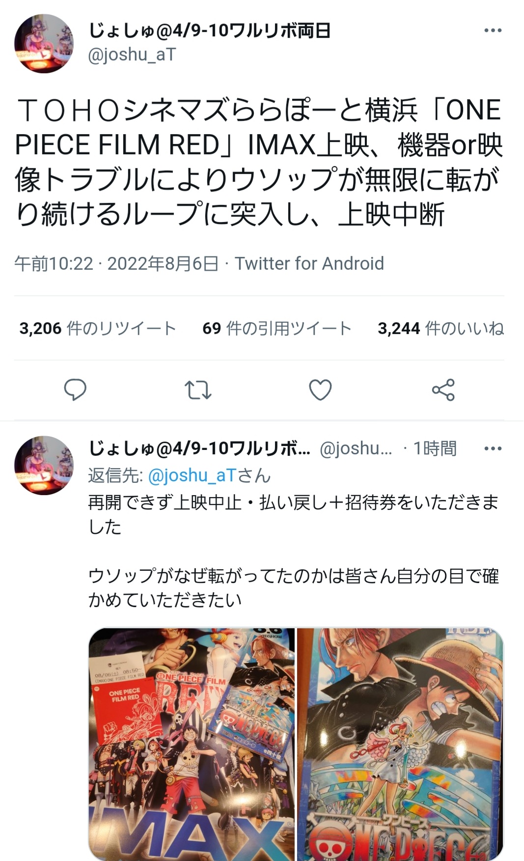 【速報】映画「ワンピース フィルムレッド」でウソップが無限に転がり続けるバグが発生し上映中止