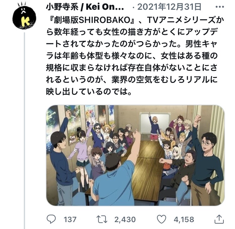 【悲報】フェミ映画評論家、『劇場版SHIROBAKO』にブチ切れ「男性は年齢も体型も様々なのに、女性はいかにもなアニメ絵美少女ばかり。いい加減アップデートしろ」
