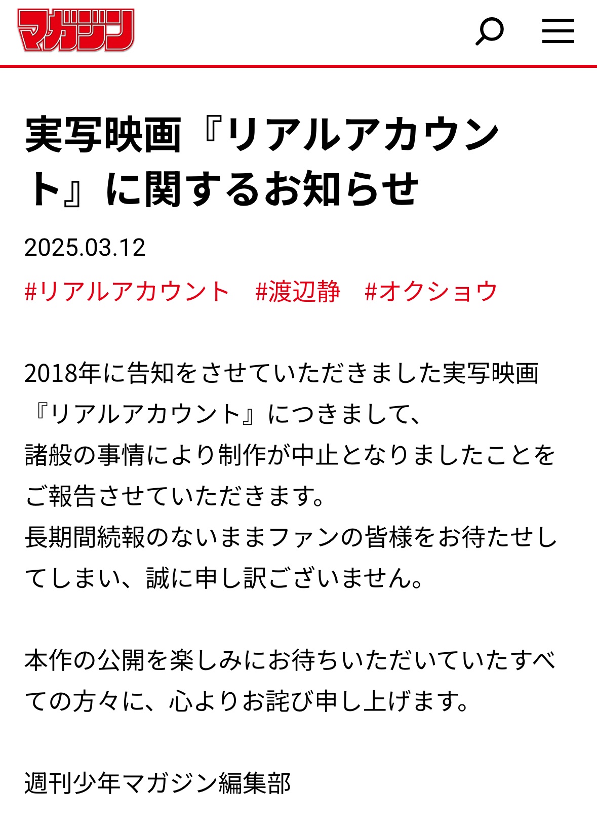 【悲報】マガジンの人気漫画、実写映画化が中止にwwww