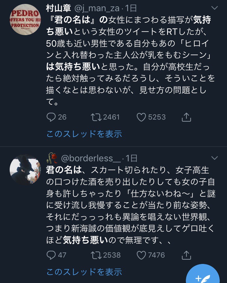 【画像】フェミさん「映画『君の名は』で女性を侮辱している地雷シーン一覧がこちらです」