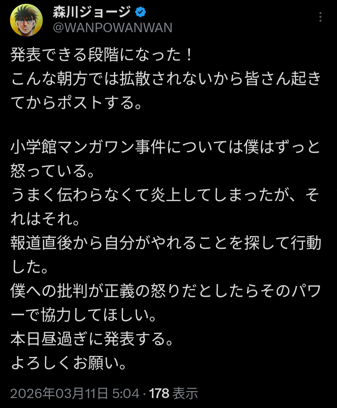 【悲報】はじめの一歩作者「マンガワンの加害者がもし冤罪だったらどうするんだ????????」