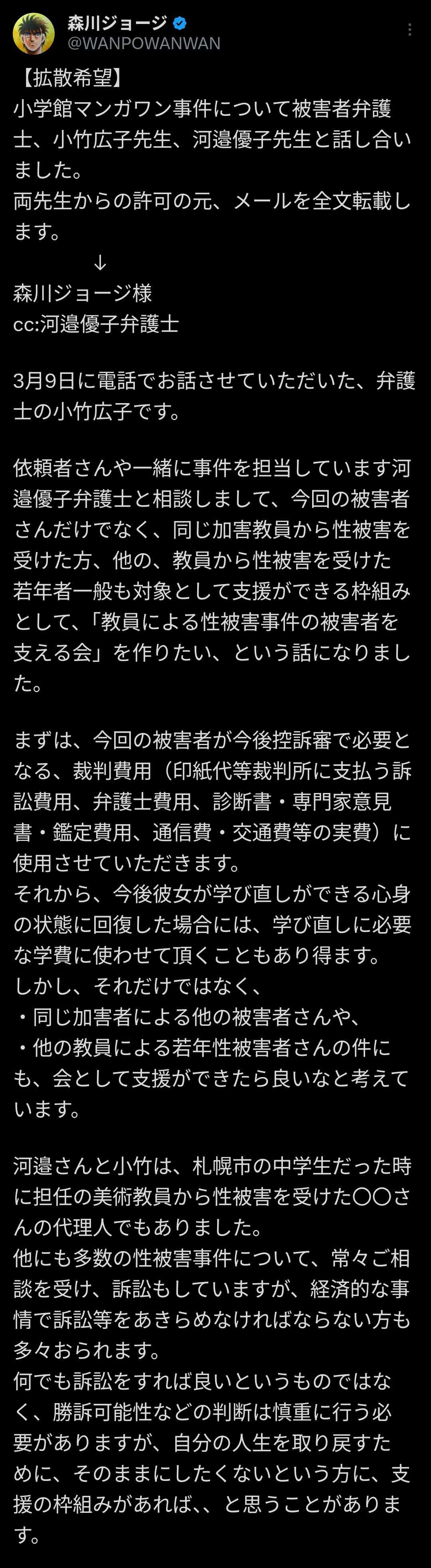 【朗報】はじめの一歩作者、遂に動く。「教員による性被害事件の被害者を支える会」発足へ
