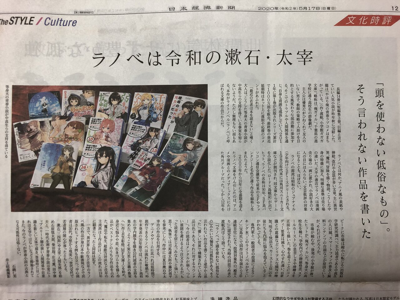 今日の日経新聞にラノベの記事!『ラノベは令和の夏目漱石・太宰治』『頭を使わない低俗なもの!そういわれない作品を書いた』『今のラノベが青春小説の古典となる可能性は低くない』