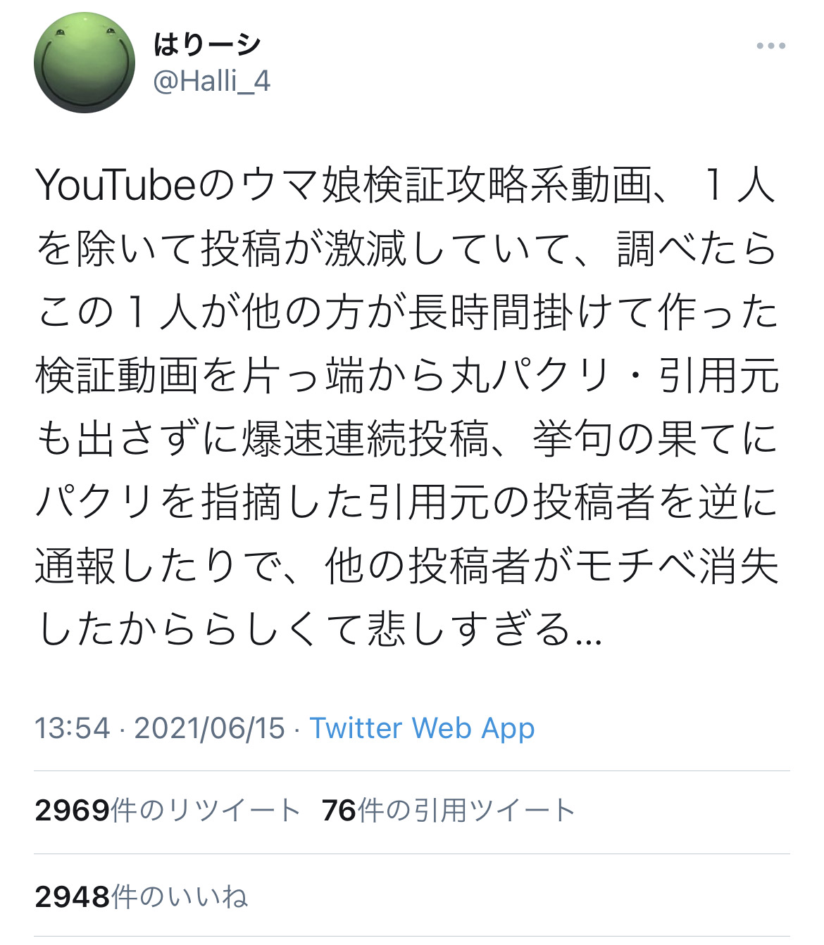 【悲報】ウマ娘攻略系のYouTuber、パクり騒動で激減してしまう