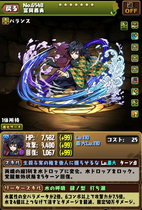 【パズドラ鬼滅の刃】冨岡義勇の能力公開!全パラ2倍の水4個消し3コンボ加算!つえー!