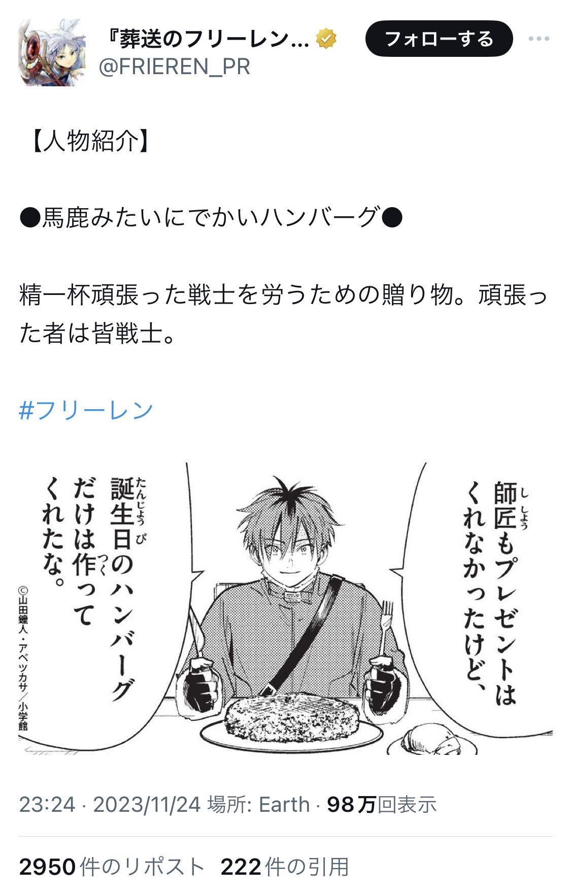 【話題】『葬送のフリーレン』ハンバーグが登場、アニメファン入り乱れ大論争 「異世界ファンタジーに…けしからん」