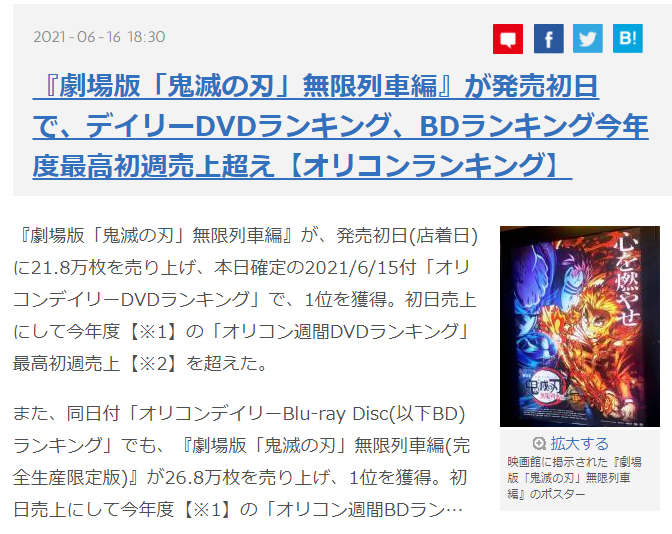 『劇場版「鬼滅の刃」無限列車編』の円盤売上が初日48.6万枚…アナ雪の66万枚には届かず………