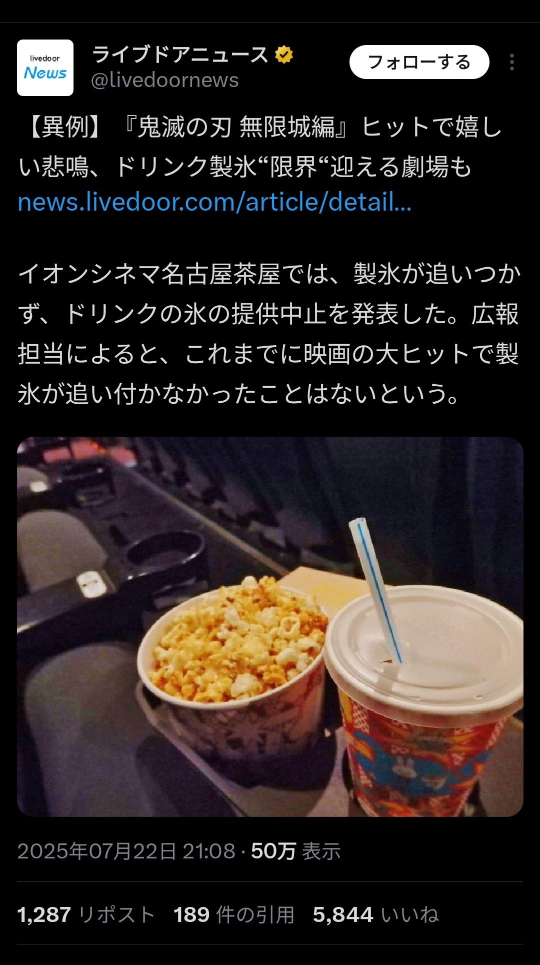 【悲報】映画「鬼滅の刃」、ヒットし過ぎてドリンクの「製氷」が追いつかなくなるwwww