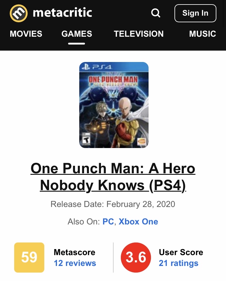 【悲報】ワンパンマンの新作ゲーム、海外で酷評 メタスコア59に…
