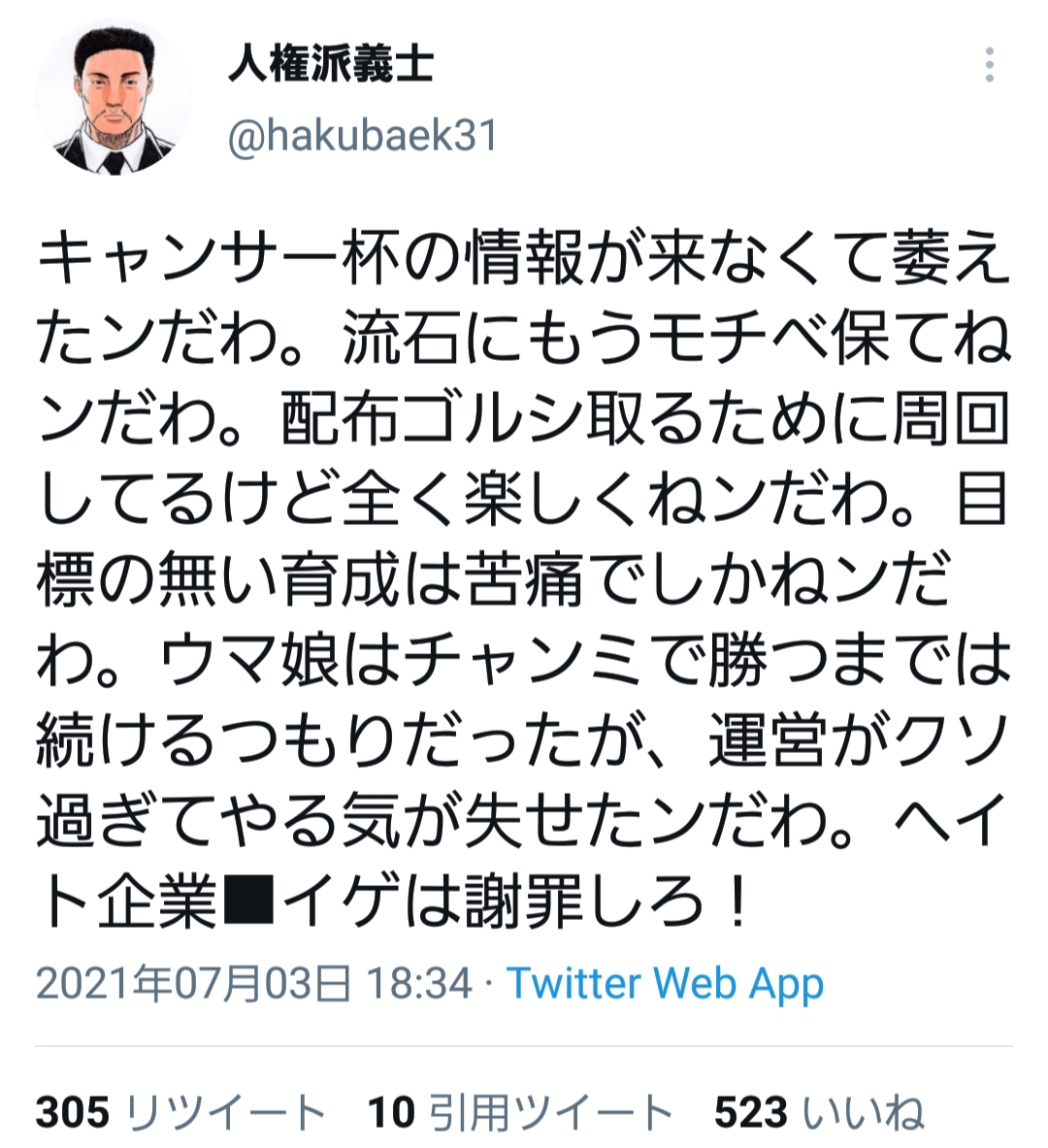 【悲報】テコンダー朴作者、ウマ娘運営にヘイトスピーチwwwwww