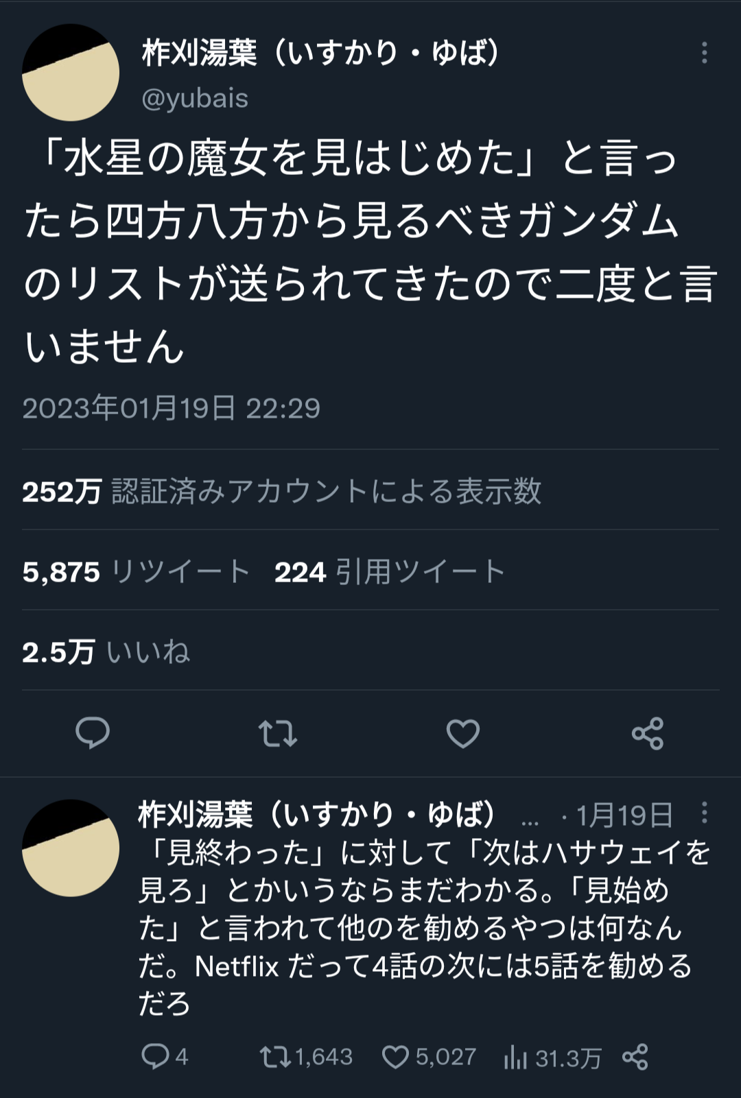 【悲報】作家「水星の魔女見始めました!」ガンダムおじさん「?!」シュバババ