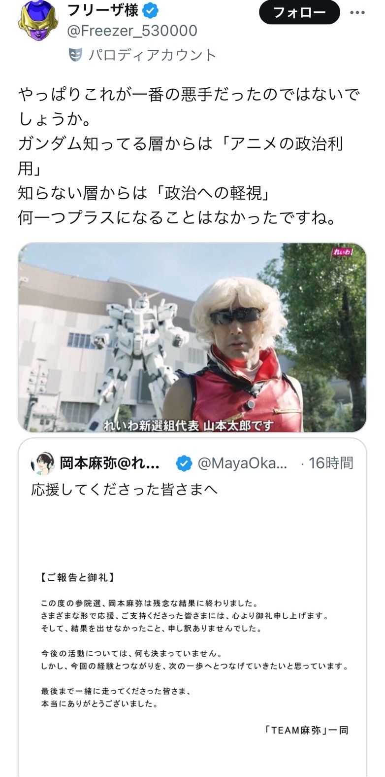 【悲報】声優「参院選は残念な結果に終わりました」フリーザアイコン「これが悪手だったのでは」
