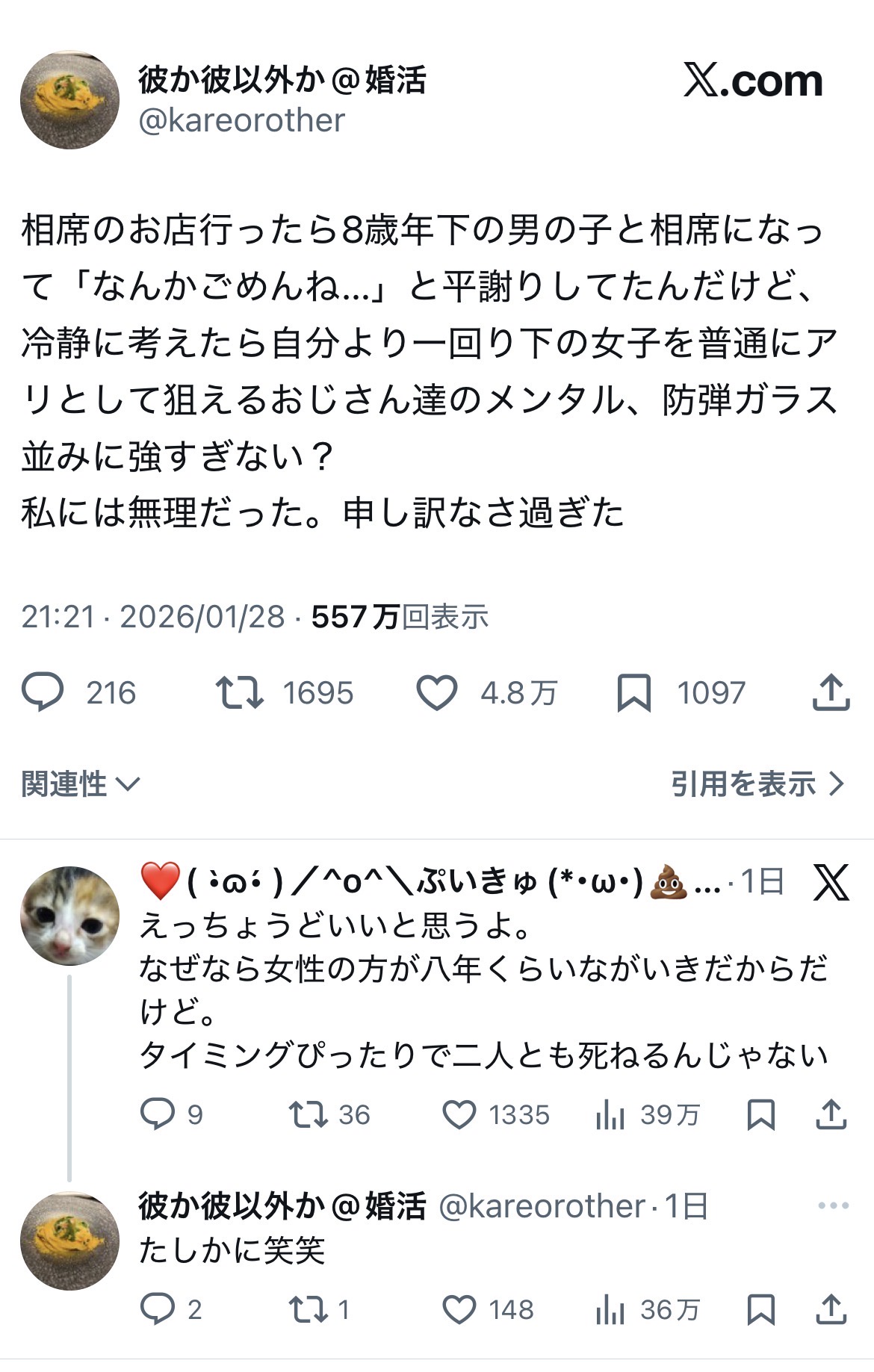 【悲報】女さん「相席屋で8歳年下男と相席になって「なんかごめんね」と平謝りした。一回り下の女子を狙えるおじさん達のメンタル強すぎない?」