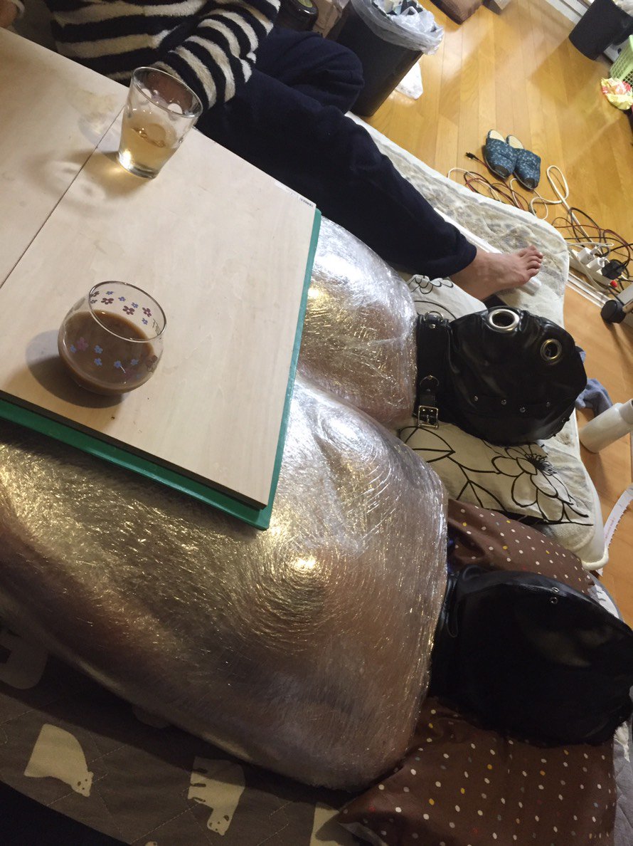 【画像】陽キャ「友人をラップでぐるぐる巻きにしてテーブルにしてみたw」パシャ