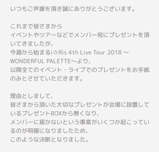 【悲報】アイドル声優グループ『i☆Ris』、ライブ会場でメンバー宛てプレゼントBOXの中身が無くなる事態が発生し今後は手紙のみへ