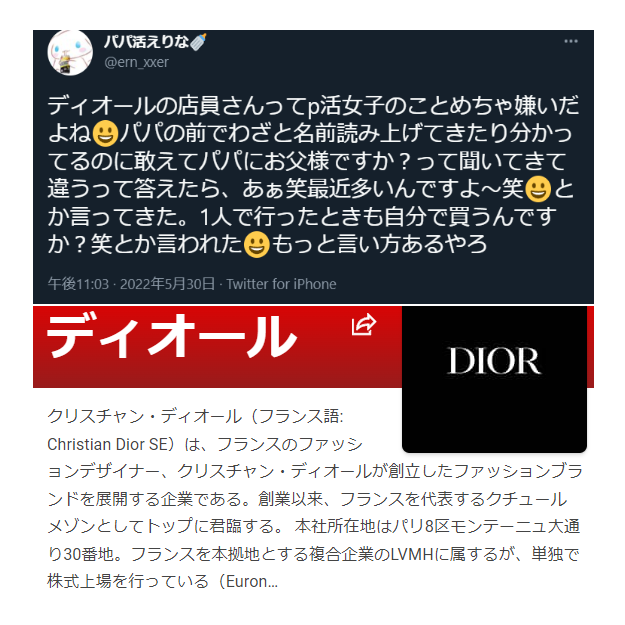 【悲報】パパ活女子「ディオールの店員ってパパ活女子のことめちゃ嫌いだよね。妬んでるのかな?」