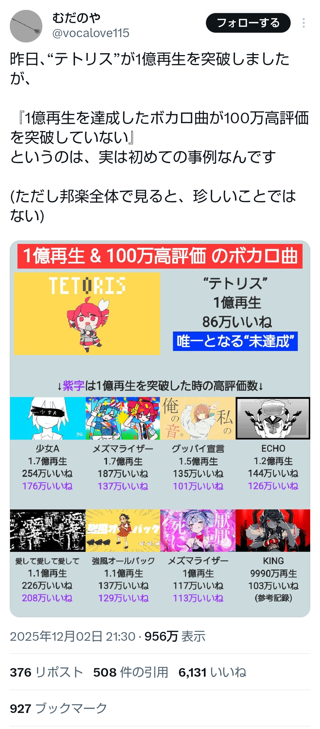 【疑問】ボカロオタ「1億再生を達成したボカロ曲が100万高評価を突破していないのは『テトリス』が初めて」←なんで?