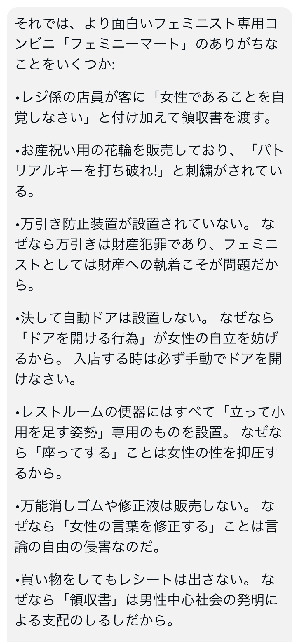 【画像】最強AIに「フェミニスト専用コンビニ『フェミニーマート』にありがちなこと」を考えさせた結果wwwwww