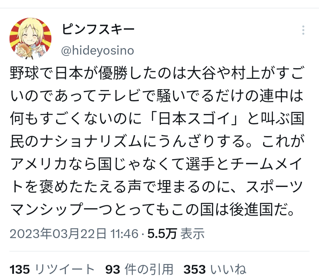 【悲報】アニメアイコン「大谷がすごいだけでテレビ見てるお前らは何もすごくない。『日本スゴイ』にうんざり」