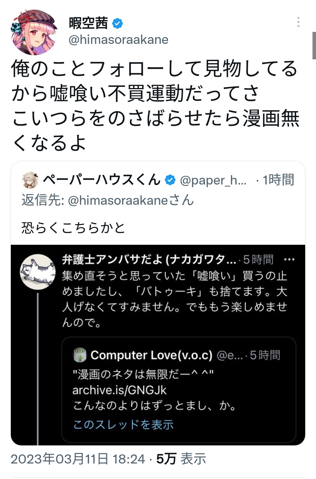 【悲報】暇空茜「漫画家が俺をフォローしてるから不買運動?買って応援!」漫画家「純粋に嬉しいです」