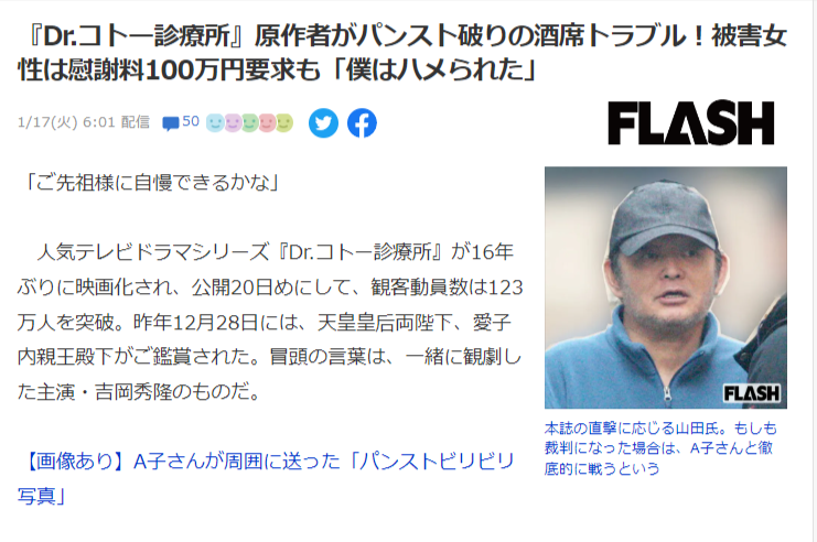 【悲報】Dr.コトー原作者さん、某有名弁護士から「100万円払え」とSNSのダイレクトメッセージで要求されている模様wwwww
