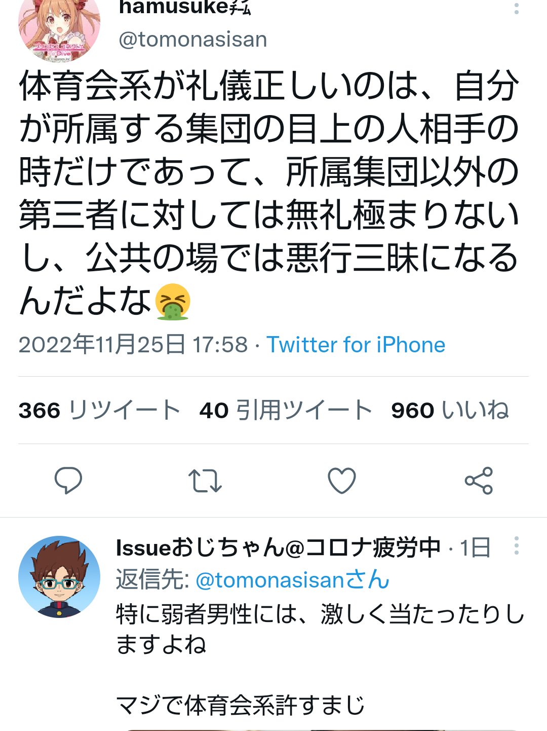 【悲報】アニメアイコン「体育会系が礼儀正しいのは目上の相手にだけ。公共の場では悪行三昧になる」