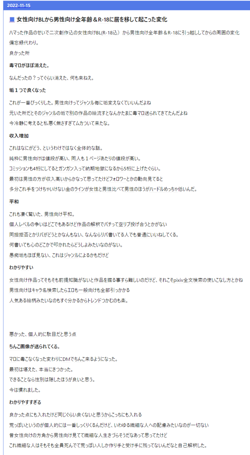 【悲報】女漫画家「女向けBLから男向けに転向したらめちゃくちゃ治安が良くなった!収入も増加した!!」