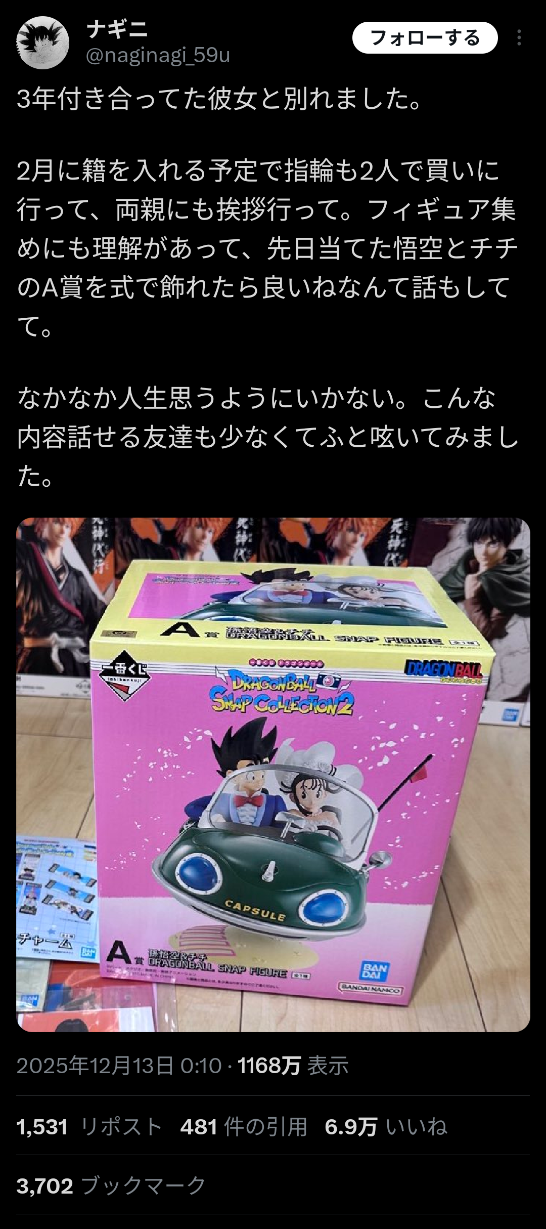 【悲報】フィギュアオタク「結婚予定だった彼女にフラれた。ドラゴンボールのフィギュアも式で飾ろうと話してたのになぜ…」